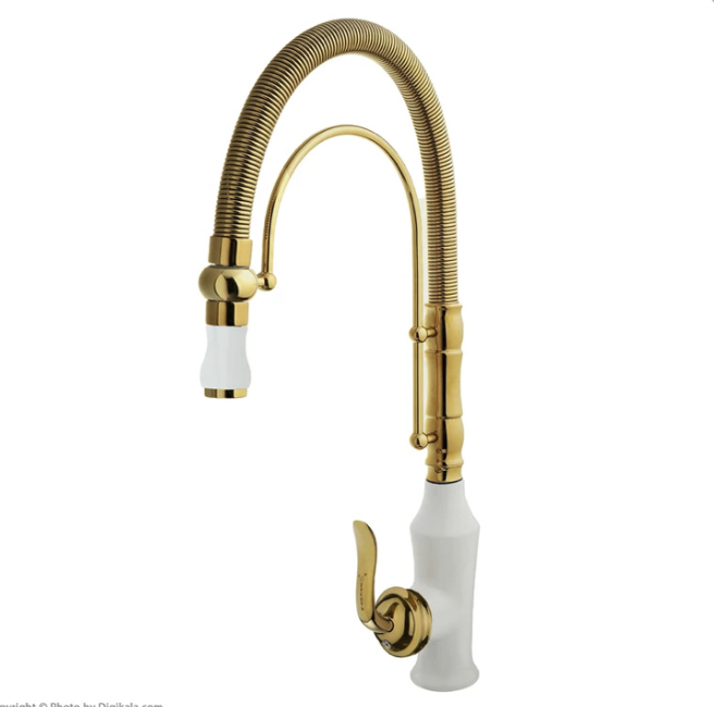 ست ۶ تکه شیرآلات سفیدطلایی مدل بامبو با شیر ظرفشویی شاوری فنری فانتزی اعلا و روشویی بلند